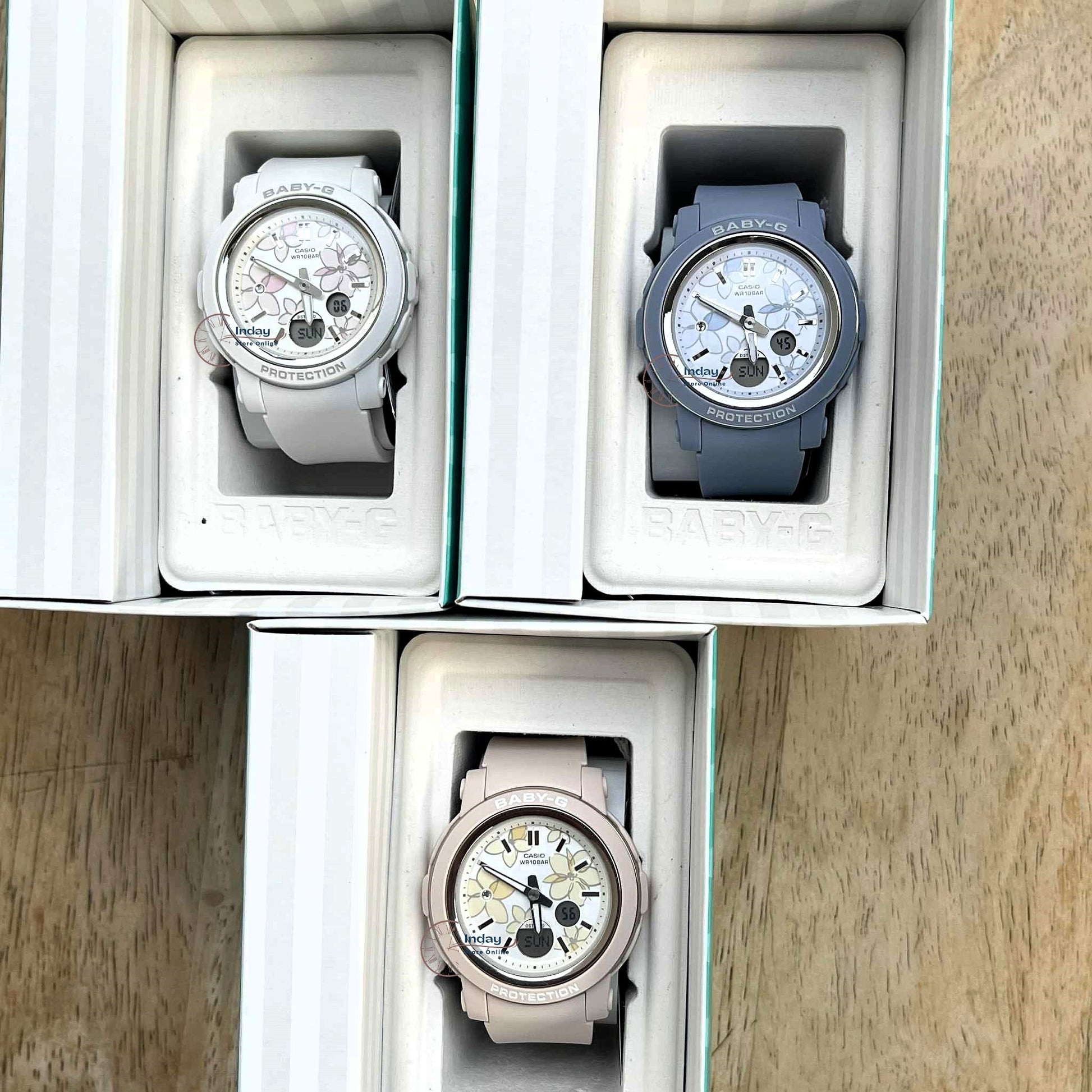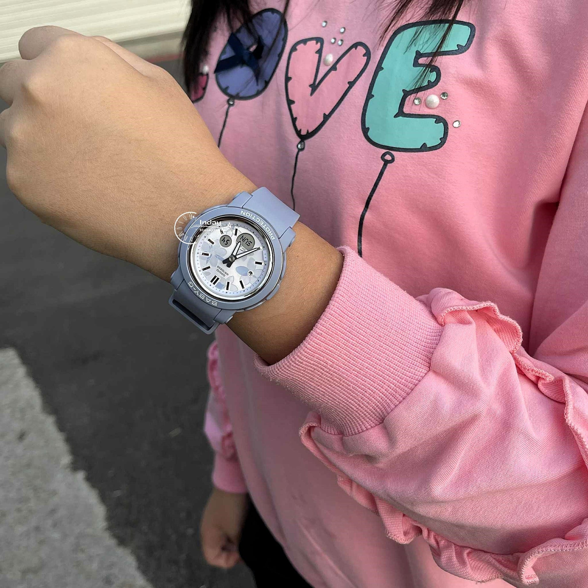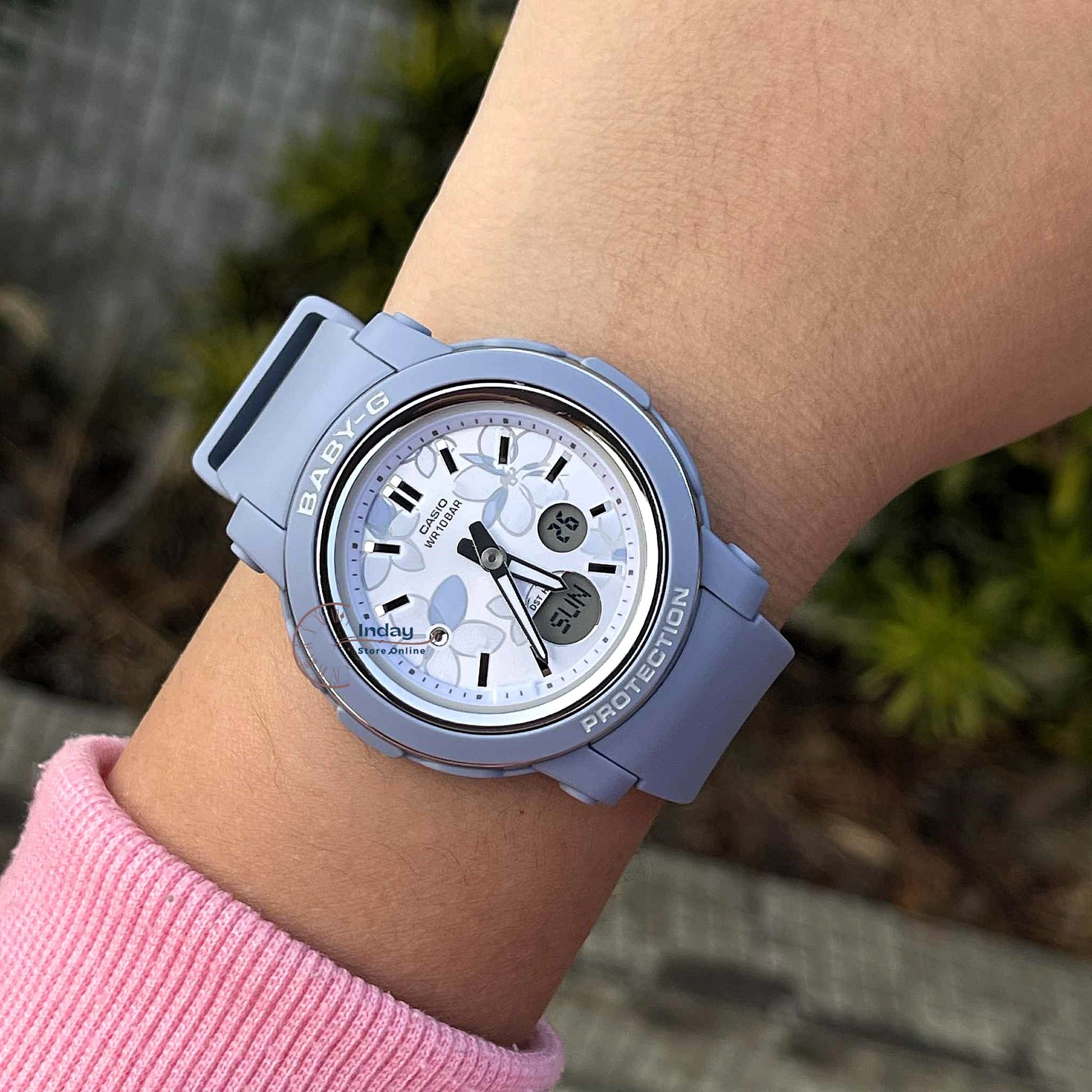 Casually stylish, actively tough — a shock-resistant BABY-G dressed in delicate flowers, pretty and powerful. The BGA-290, with round case and wide face for optimal readability, features a dial adorned with an elegant flower design, lending a touch of glamor to your wrist. A crystal at the center of the flower at the 9 o’clock index adds sparkle, while the bezel ring’s vapor deposition finish brings in a beautiful metallic texture. When it comes to function, the BGA-290FL delivers shock-resistant construction, 100-meter water resistance to free you from worry when swimming, and more.