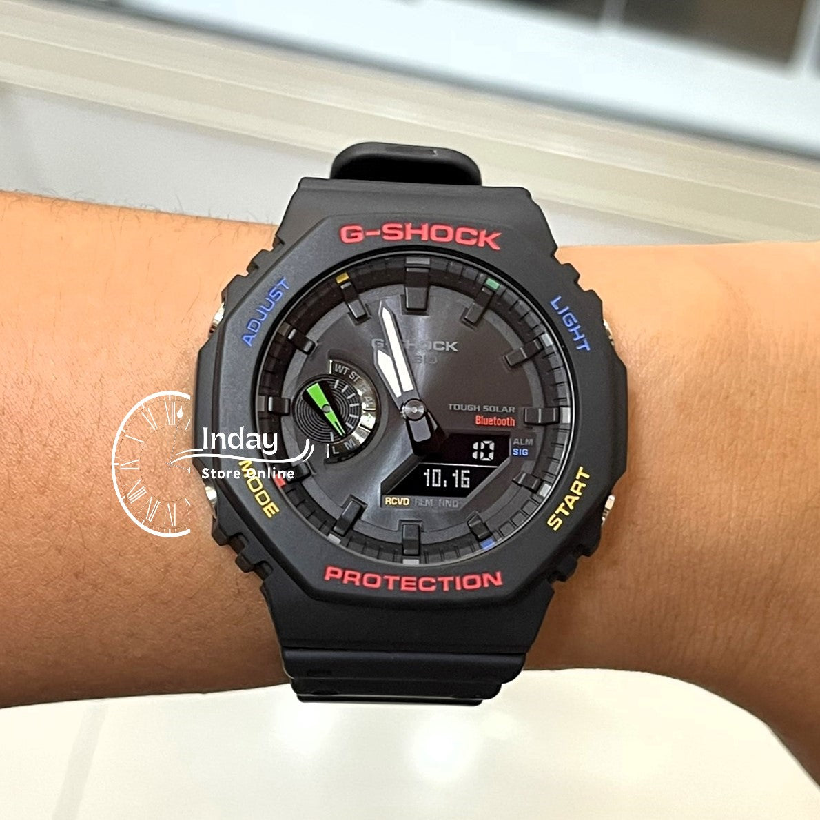 Who says you can’t be playful and tough? Introducing the rugged G-SHOCK dressed up with splashes of colorful accents — ready to party and play. The watch is based on the GA-B2100, which maintains the distinctive octagonal form of the GA-2100 and has handy functions like Smartphone Link and Tough Solar charging. It also employs the Carbon Core Guard structure to preserve a similar fit on the wrist as the original model. Monotone base colors — black, white, and green that easily coordinate with your favorite fashions — are decorated with bright red, blue, yellow, and green accenting on the bezel inlay sections, dial components, index markings, and the indicator of the inset dial at the 9 o’clock position. The result is a special treat of minimalist design splashed with a stream of confetti-like color. A great way to celebrate in playful casual style — whether hanging out with friends or rocking it at an outdoor concert or festival.