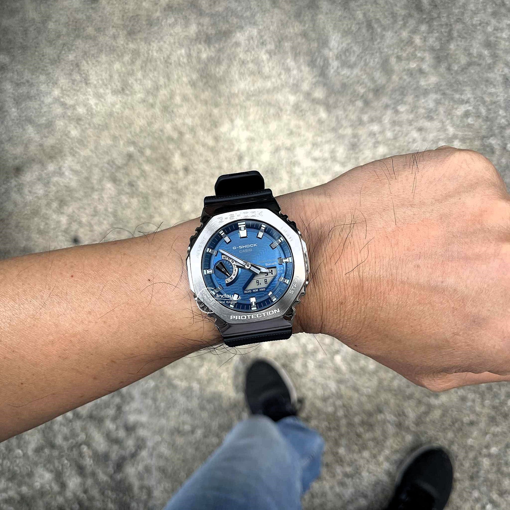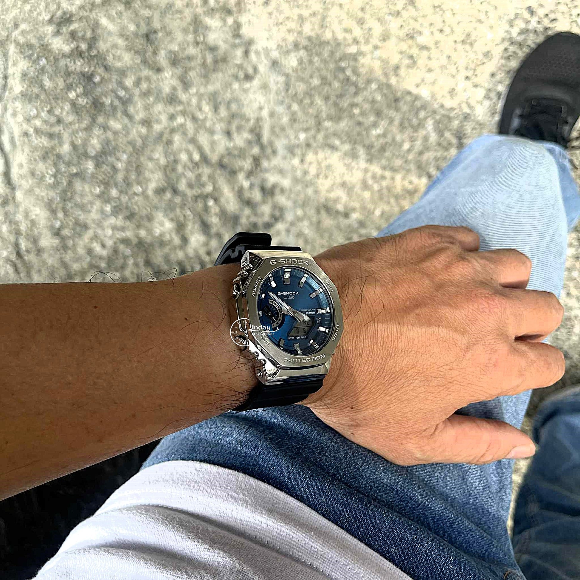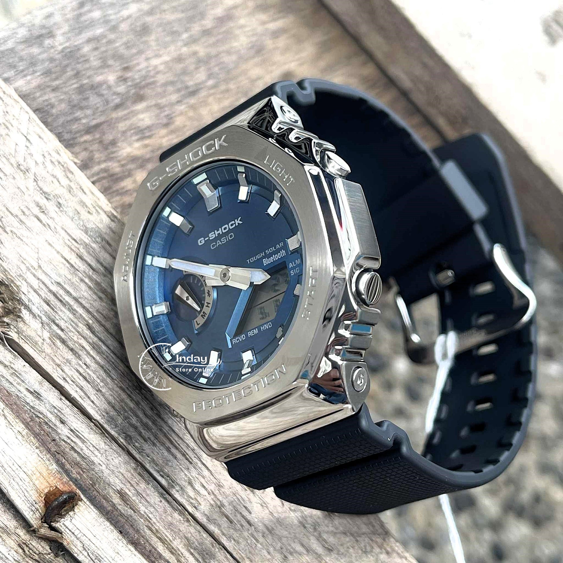 Smart and stylish, sleek and sophisticated — a GBM-2100 with bold metal bezel that delivers Smartphone Link and Tough Solar charging system, all in the same compact size. Key resin components used in the case and band are made with environmentally responsible bio-based resin. Choose your favorite color combination of vapor deposition finishes — the GBM-2100A-2B with blue dial and silvery indexes, the GBM-2100A-4B with burgundy dial and silvery indexes, or the GBM-2100A-8B with light yellow gold-colored dial and black accented indexes. Tough construction and stylish design in a timepiece that takes you from casual settings to business meetings with ease.
