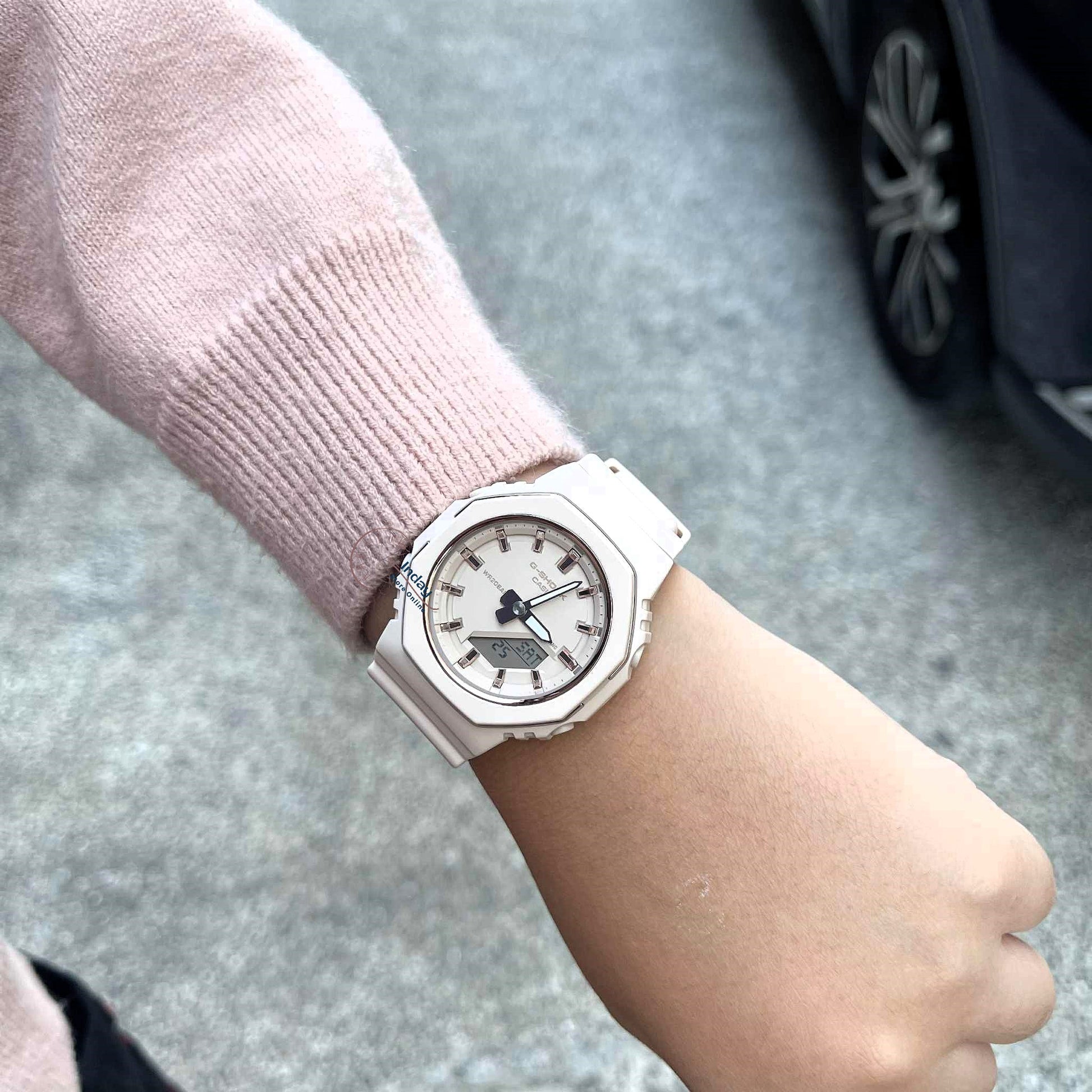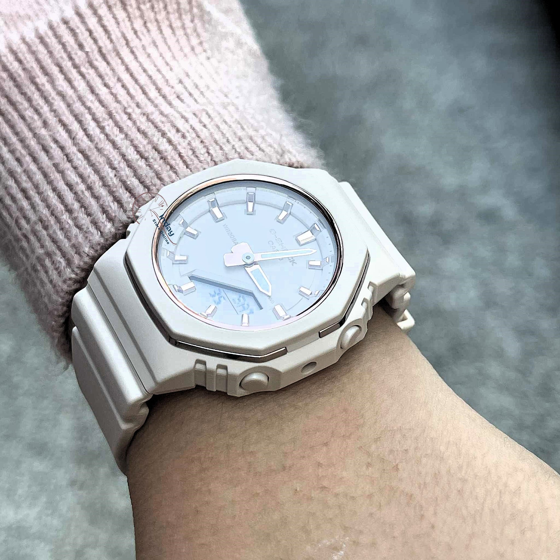 A real standout in the popular digital-analog line of G-SHOCK watches, the GMA-P2110 features a slim metallic ring that catches the light from both the inner and outer edges of the bezel. While comparable to the GMA-P2100 in compact size and comfortable fit, this watch adds an elegant, contemporary touch with the subtle shine of metallic accents. The streamlined bezel leaves out logos or mode indicator engravings for a cleaner, more minimalist finish. Bar indexes are shaped with sharper definition compared to those of the GMA-P2100 watches, adding to the watch’s refined, sophisticated feel. Available in black, beige pink, and white — versatile colors that easily complement anything you wear — the GMA-P2110 brings a clean, stylish accent to your street-ready look. Key components for the bezel and band are made with bio-based resin. Produced using renewable organic resources, this material is expected to help reduce environmental impact.