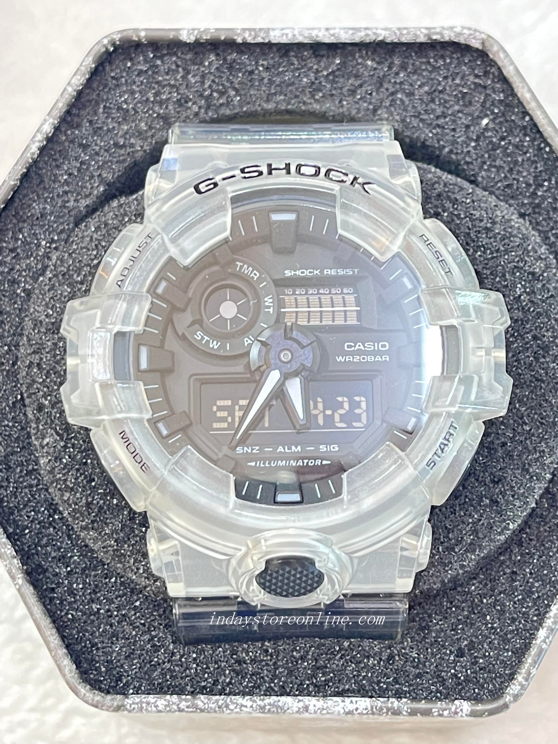From G-SHOCK, the toughness watches that are ever evolving in an endless pursuit of strength, the skeleton series models are made from translucent resin parts. The coloring is clear with a white base. Based on the dynamic 3D-face design of the GA-700, this skeleton series model features chic coloring making it suitable as a fashion item.